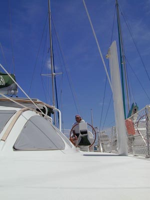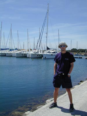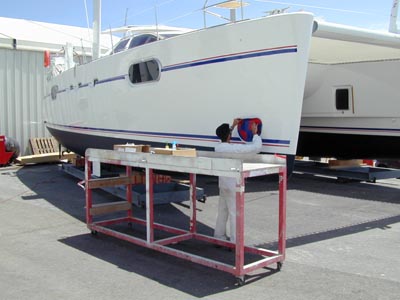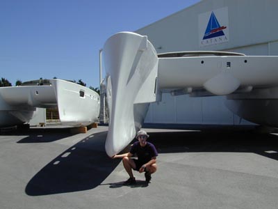 JF standing in front of a 58-foot Catana (the WILDLIFE hull is on the far left... yippee!!!)