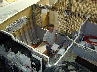 A Catana boat builder installing electrical wiring and plumbing on a catamaran
