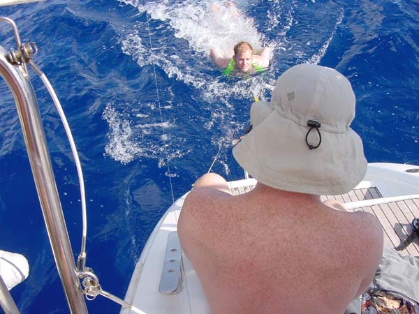 Helge wearing a harness and body surfing behind the catamaran. An ideal substitute for a shower.