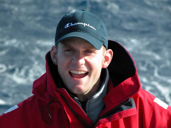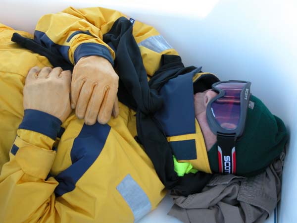 Renke Thye all wrapped up! We use ski goggles to protect our eyes from the wind when Wildlife surfs down waves at 26 knots (29 miles per hour).