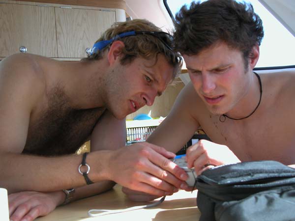 Florian and JF tinkering with one of the digital cameras that were used to document the trans-Atlantic journey.