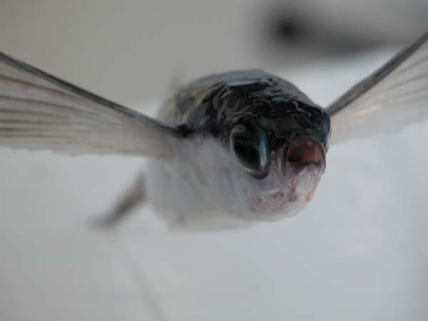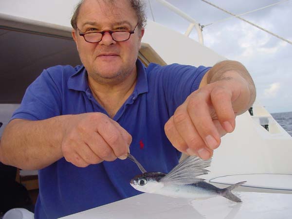 Andreas Wilken holding a Flying fish (Cypselurus melanurus) with 30 cm wing span.