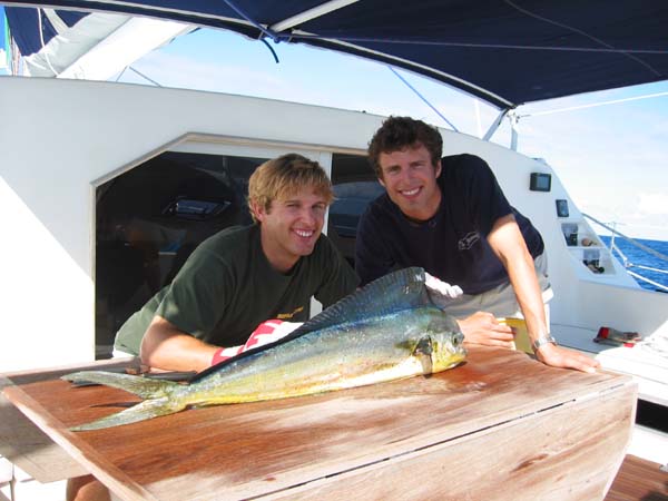 Florian and JF with dinner. Sailors depend on their fish catch for fresh food at sea.