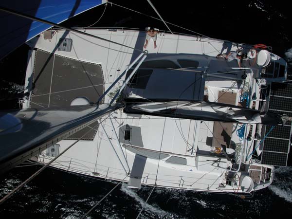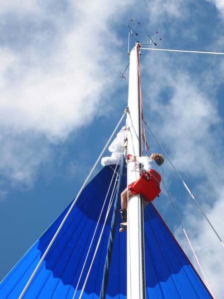 JF being hoisted up the mast via the spinnaker halyard to repair the deck light which was torn off the mast during a jibe.