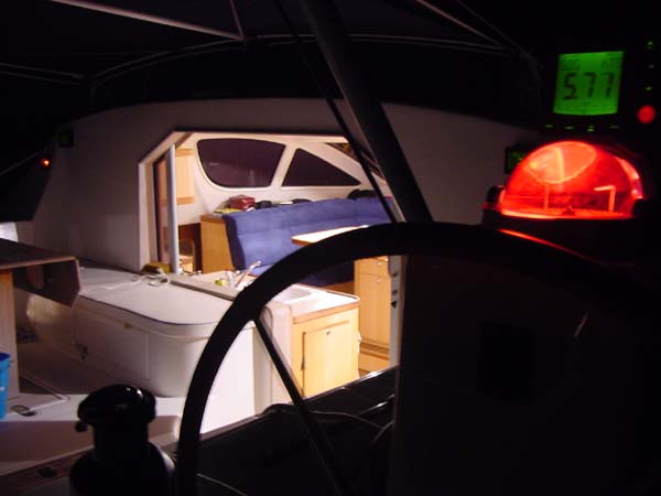 A view from the starboard helm station. The compass and Auto Pilot display illuminated on the steering column.