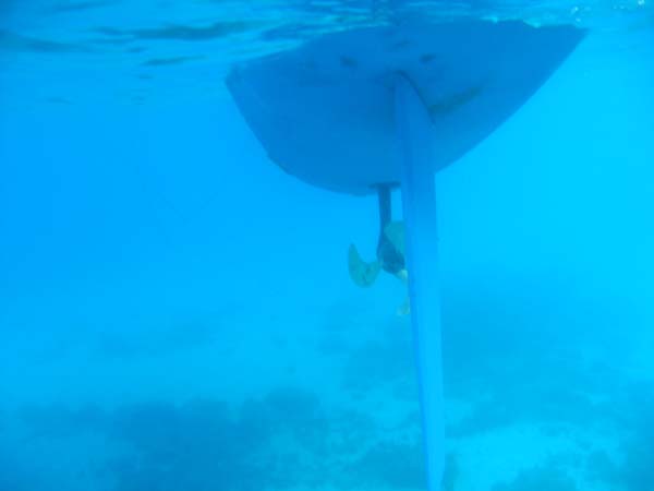 The Wildlife catamaran's starboard hull and rudder. We often skin dive underneath the boat for inspection and cleaning.