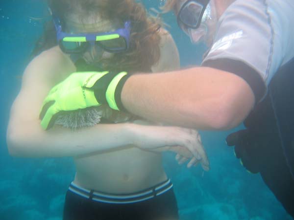 Flo placing a Sea Urchin on Kate's arm. The animal has little barbs that cling to your skin but are not painful.