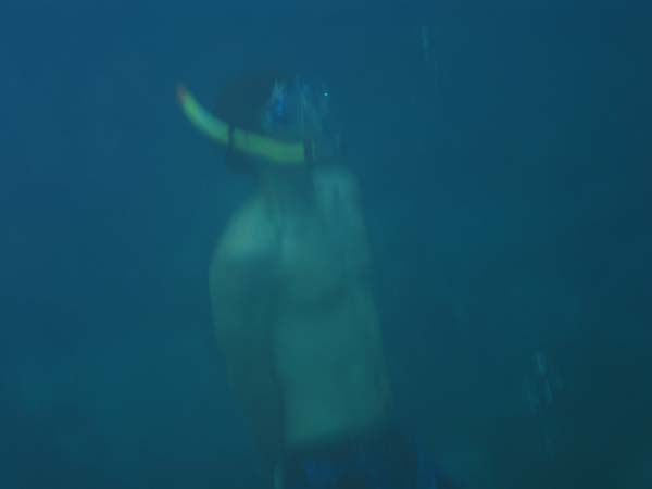 Dark water surrounds JF as he resurfaces from an 11 meter dive.