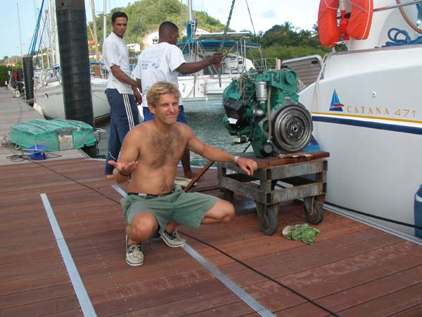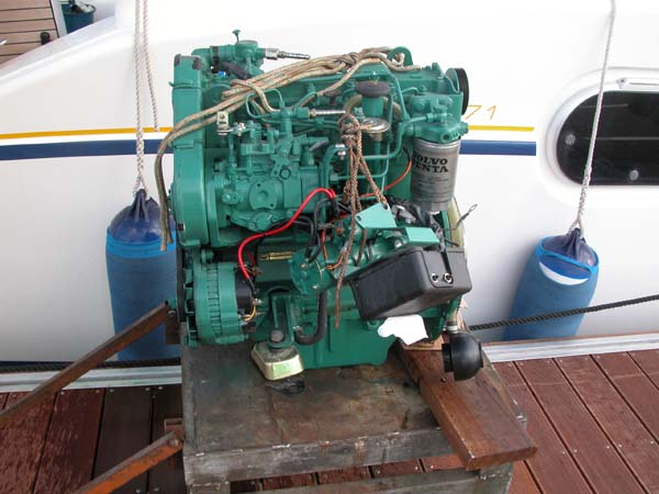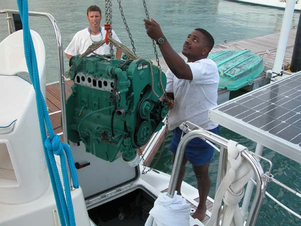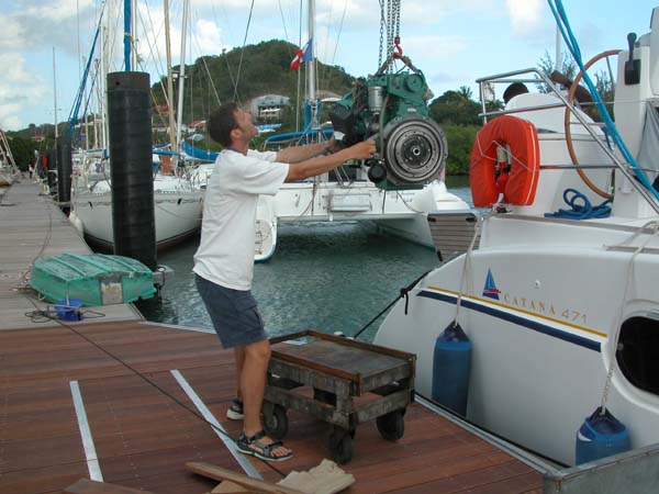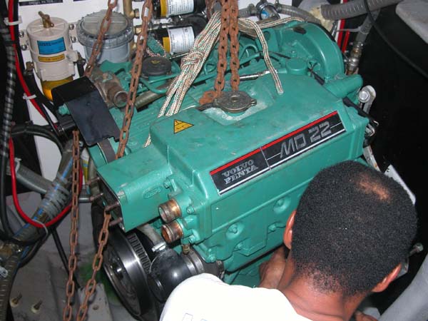 We slowly lower the engine onto a cart on the dock, from where it will go directly to the shop.