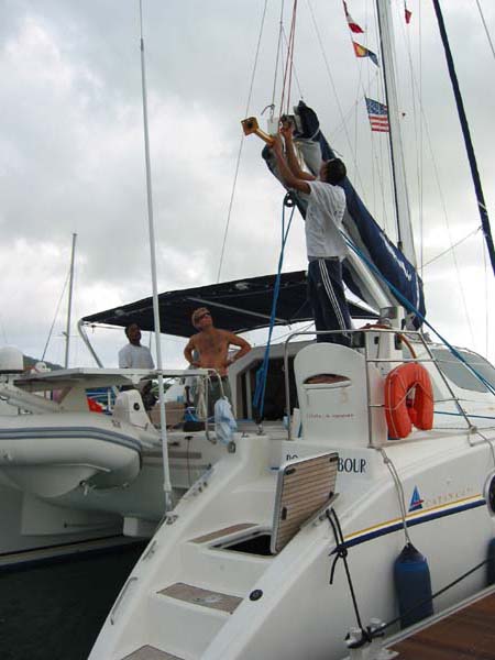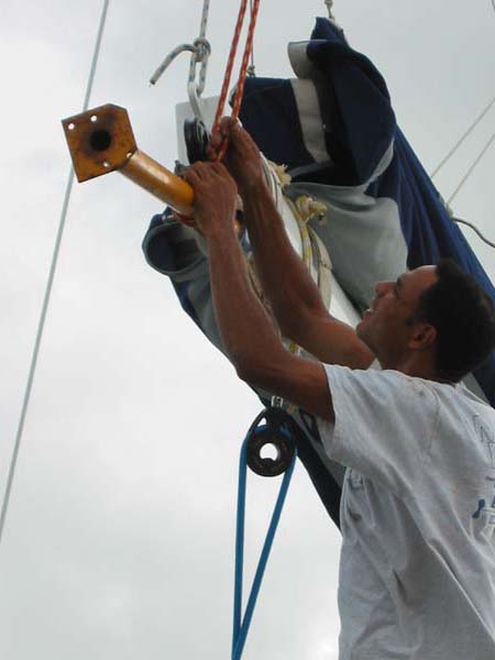 We attach the main halyard to carry most of the load of the 400 kg engine.