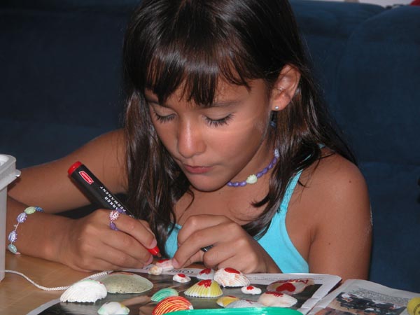 Helen and Maiva are painting shells that they collected on the beaches around Le Marin.