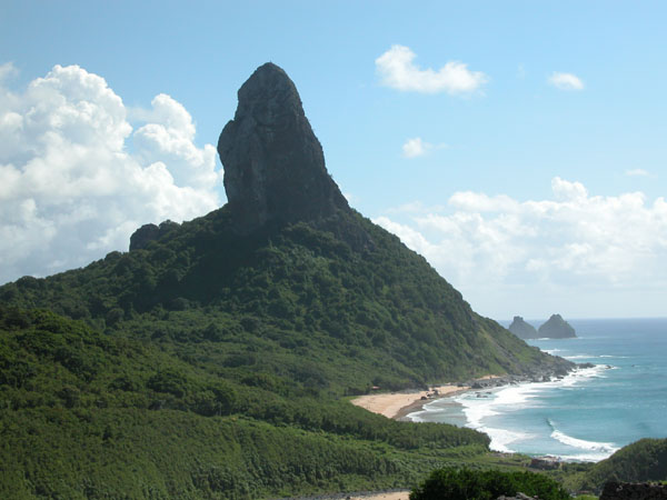 One of the famous views of 'Fernando de Noronha': The 'Pico', with its surrounding beaches and the rock formation 'Dois Irmaos', the two brothers, to the right of it.