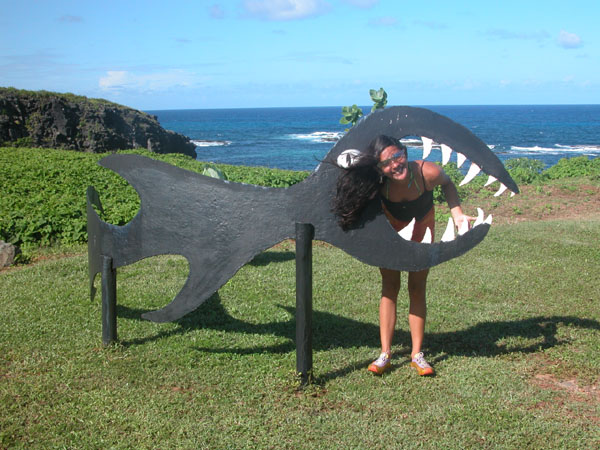 Underwater, Ursula is afraid of sharks. Above water, she seems to show no fear.