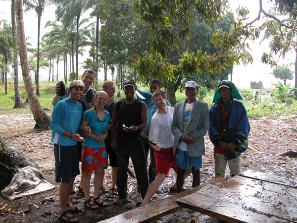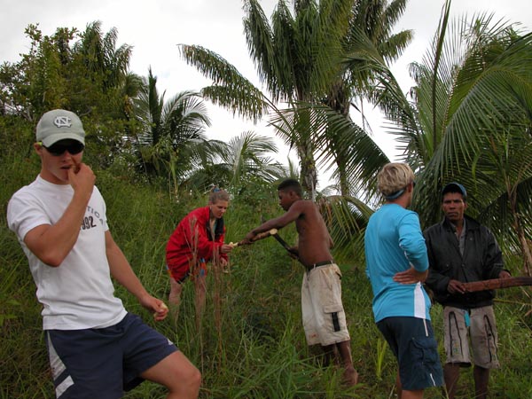 A group of local surveyors serve us fresh coconuts picked from the wet forest ground.