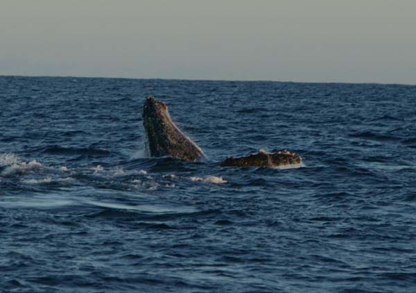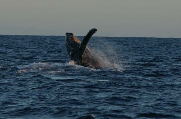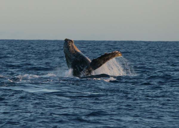 Whales, very close, on our port side ! A humpback whale leaps out of the water aprox. 40 meters away from WILDLIFE.