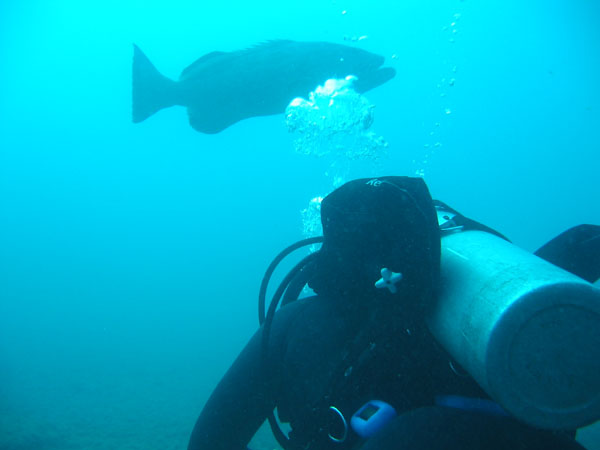 While JF and Florian dive through the famous coral heads of Abrolhos, 3 big 'Badejos' followed them for most of the dive.