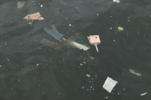 Piles of trash floating everywhere around the commercial docks of Niteroi.