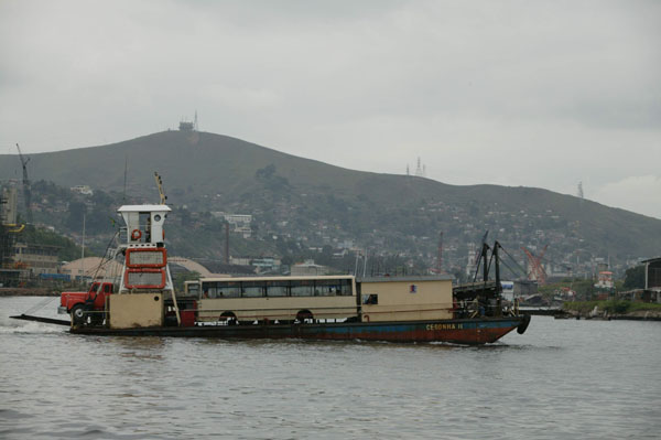 Car ferries crossing the river of Guanabara Bay without making any fuss securing the cars or busses.