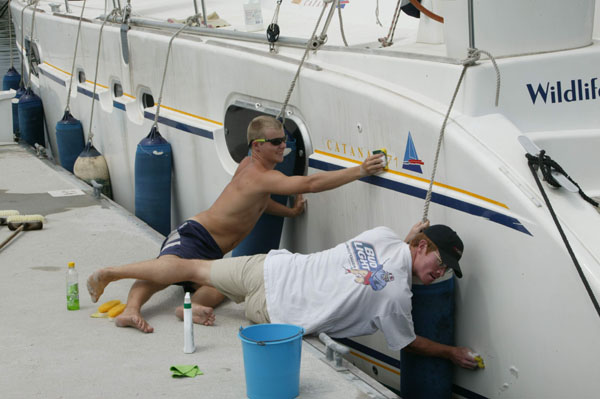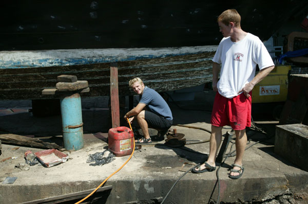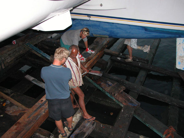 Our boat was in mid air, accessible only by a 15-foot ladder. Our facilities aboard were definitely out of commission, 'cause flushing the toilet' onto our workspace below is something we can not do, due to the lack of water.