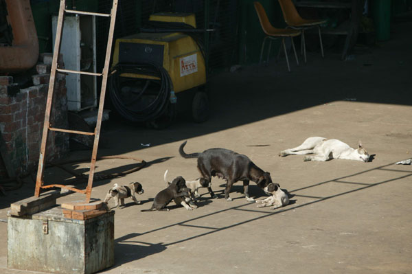 These dogs were our daily company on the dock between landscapes of massive rusted metal plates, human waste, household trash, oil and paint spills.