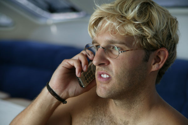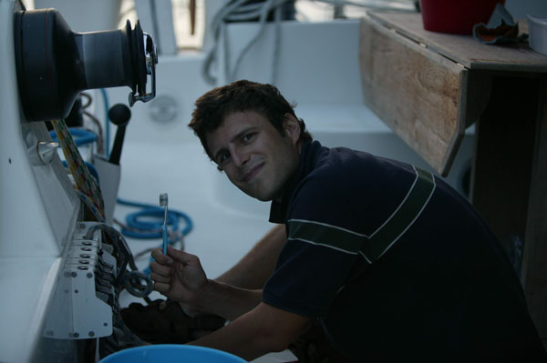 Florian in a typical pose on the cell phone organizing the painter, the owner of the shipyard and the fiberglass specialists to meet at the dock.