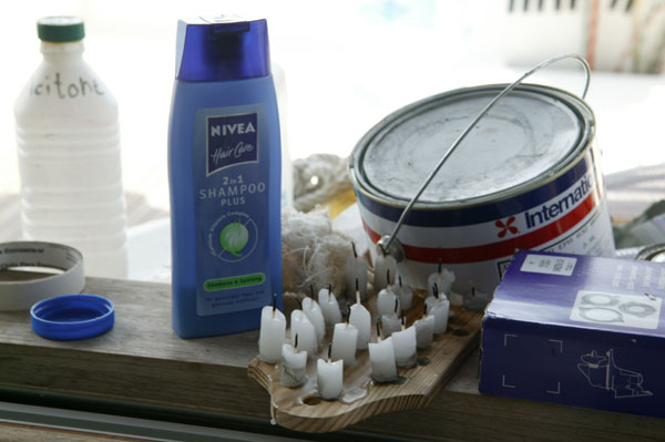 Over the days our boat turned from it's original brilliant white, to gray, and finally to a putrid brownish color. Acetone, paint and shower soap have become part of the same identity.