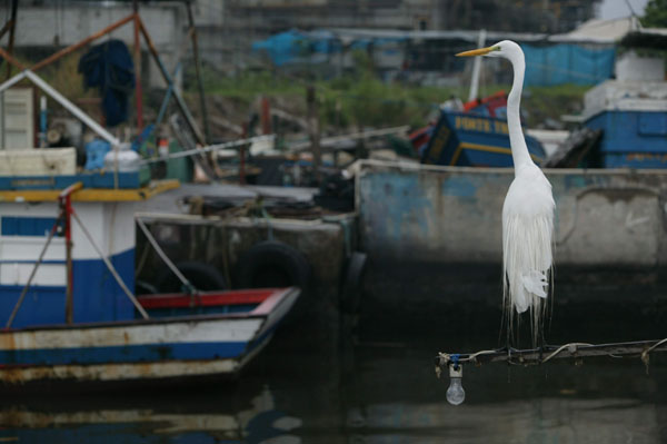 Shocking! Guanabara Bay: A fisherman throwing his net while a tanker is passing by in the background.