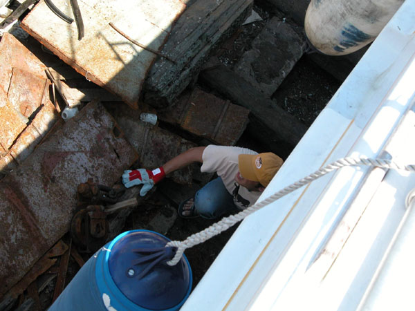 JF removing heavy and dirty steel plates from underneath the hulls to prevent the boat from further damage.
