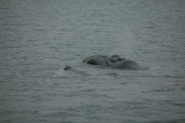 A Southern Right Whale covered with holes on his back due to the seagulls which feed of the whales.