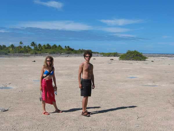 Kate and Christian standing on a dried salt lagoon observing hermit crabs.