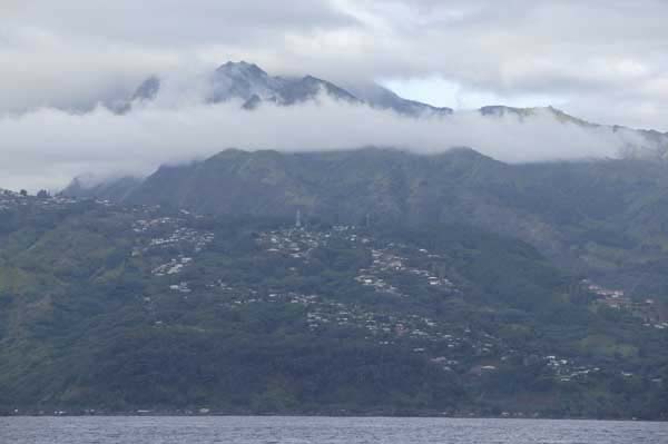 The warm sunshine rises over Tahiti. We see a lush green island with high mountain peaks welcomes us.