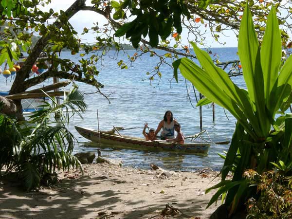 A simple outrigger boat. Children are not shy and wave you without hesitation.
