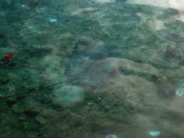 A huge manta ray with an long tail patrols the shallow harbor bay.