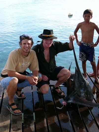 JF and Daniel holding the head of a fresh blue marlin which was caught by a local fisherman.
