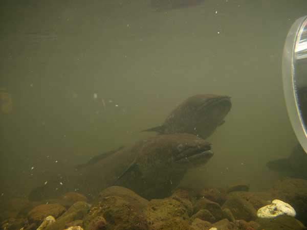 The eels were about 6inches wide and roughly 4ft long. They robbed out of the water to reach the food.