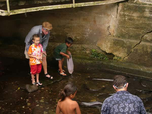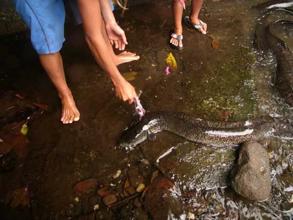 It's feeding time. Locals serve them old tinned tuna which drive the eels crazy.