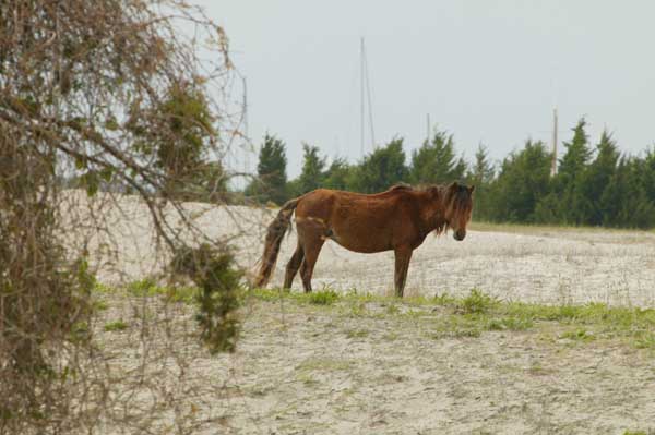 Wild horses are feeding off the small crabs and weed which is growing at high and low tide.